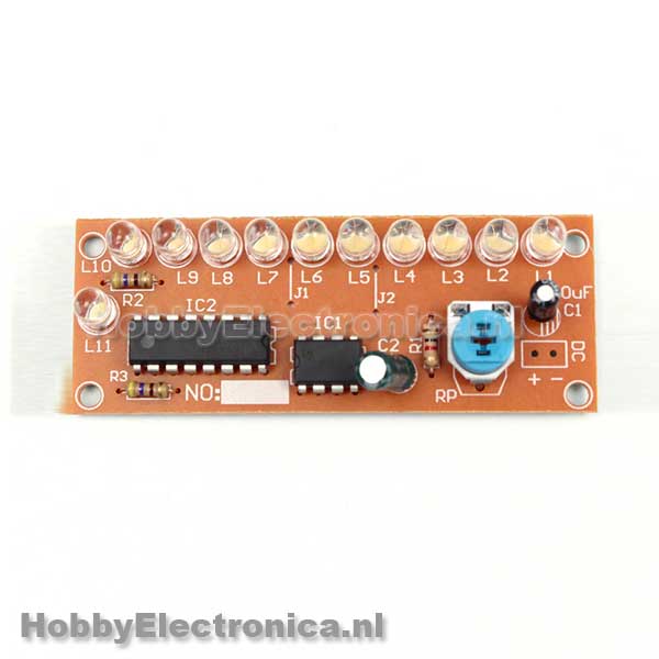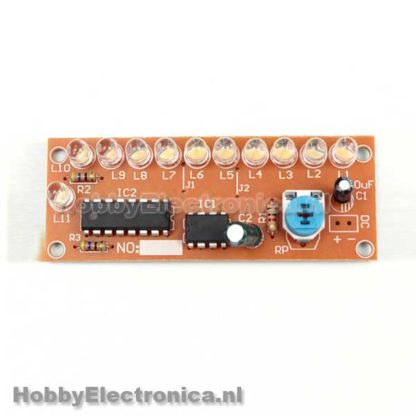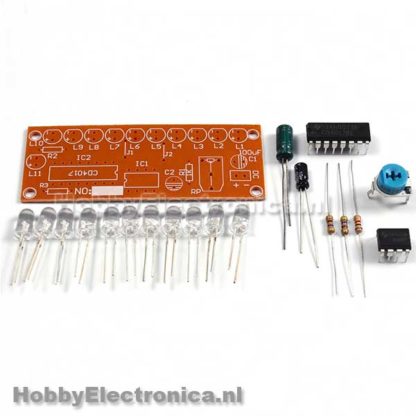 Lopende LED soldeer kit. Led gaan om en om aan soort als een soort knight rider effect. Kan worden gevoed met 4-12 Volt. Eenvoudig kit on te leren solderen. De print op de pcb laat zien waar de componenten moeten komen. Langste poten aan de componenten is de + en de korte poot de -.