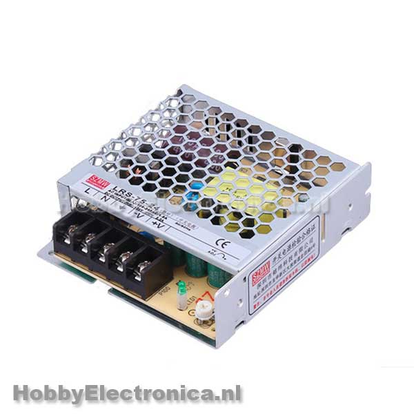 LRS-75-5 voeding 14A DC voeding van Mean Well heeft een outputspanning van 5VDC met een maximale stroom van 14A. De gesloten behuizing zorgt voor voldoende (passieve) koeling en kan door middel van de schroefgaten in ieder project geïntegreerd worden. De voeding kan op netspanning aangesloten worden en heeft een lange levensduur (5G-vibratietest, 105°C long-life condensatoren, < 0,5W nullastvermogen). Zeer geschikt voor 5 Volt microcontrollers en 5V ws2812 led strips.
