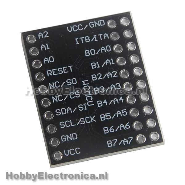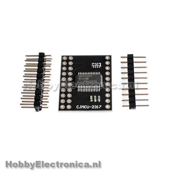 MCP23017 Seriele interface I2C SPI op een handige breakout. Voeg 16 pinnen to aan je microcontroller met de MCP23017. De MCP23017 gebruikt 2 i2c pinnen en je krijgt er 16 pinnen voor terug. De pinnen kunnen worden gebruikt als input of output.