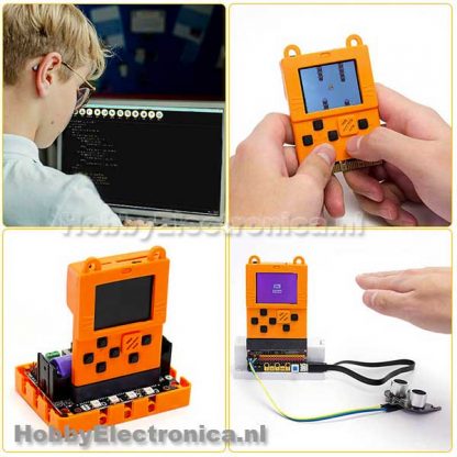 Ingebouwde lichtsensor, temperatuursensor, SD-kaartsleuf, zoemer, SD-kaartsleuf en JAC-interface. Het is compatibel met de 40 PIN’s Goldfinger van Microbit, zodat de iobit en robotbit uitbreidingen kunnen worden gebruikt. Meowbit is geweldig voor het leren coderen voor tieners, het is een zeer interessante programmeer spelmachine voor uw kind om te leren programmeren.