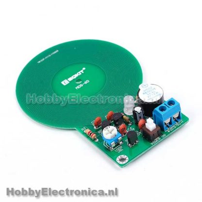 Metaal detector soldeer kit. Detecteert metalen op een afstand tot 6cm van de spoel en geeft dan een geluid of lichtsignaal bij detectie. Eenvoudig kit om te leren solderen. De print op de pcb laat zien waar de componenten moeten komen. Langste poten aan de componenten is de + en de korte poot de -.