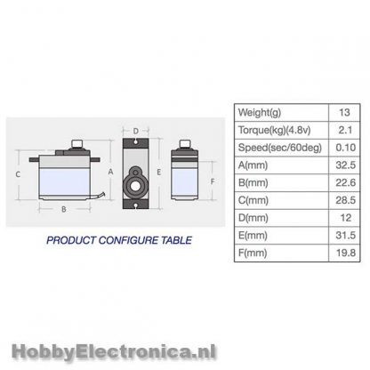 – Bedrijfsnelheid: 0.10sec/60degree (4.8V); 0.08sec/60degree (6.0V)