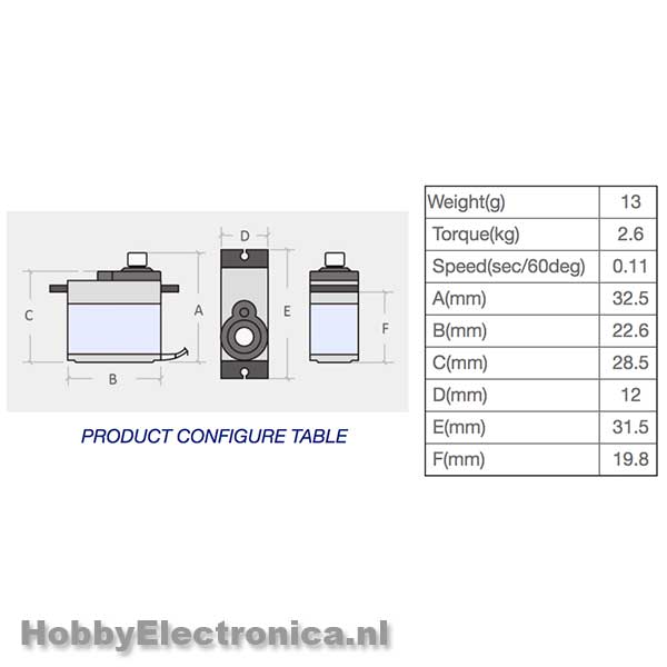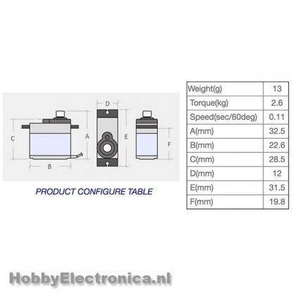 – Bedrijfsnelheid: 0.13sec/60degree (4.8v); 0.11sec/60degree (6.0v)