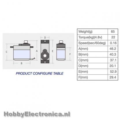 – Bedrijfsnelheid: 0.16sec/60degreeb (4.8V); 0.13sec/60degree (6.0V)