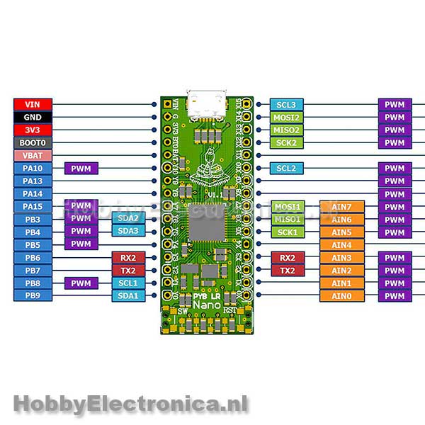– Ondersteunt 2 UART, 3 I2C, 3 SPI, 10 ADC en RTC.