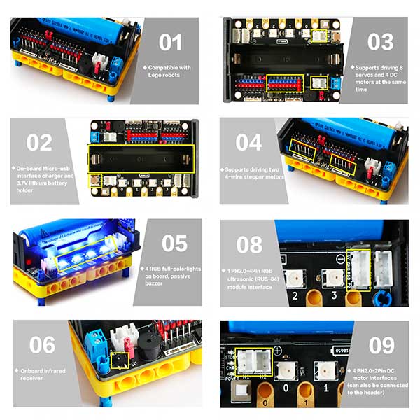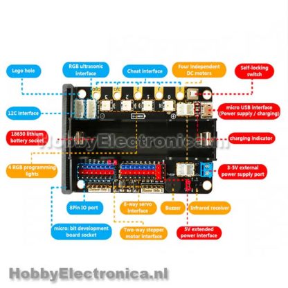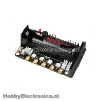 Multifunctionele extensie Micro:bit. Deze extensie voor de Micro:bit kan 8 servo’s aansturen en 4 DC motoren, heeft een infrarood ontvanger en 4 RGB led’s. Heeft een batterij houder voor een 18650 batterij en een micro usb interface met laad circuit om deze op te laden. Gemaakt om robot projecten met een microbit nog makkelijker te maken.