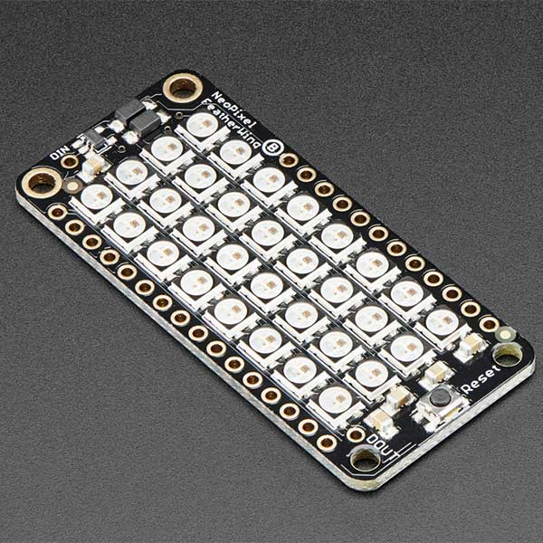 NeoPixel FeatherWing 4×8 RGB LED. Feather is het nieuwe ontwikkelings bord van Adafruit. De FeatherWing is als een shield voor de Feather borden. Gerangschikt in een 4×8 matrix, elke pixel individueel adresseerbare. Slechts één pen nodig om alle LEDs besturen.