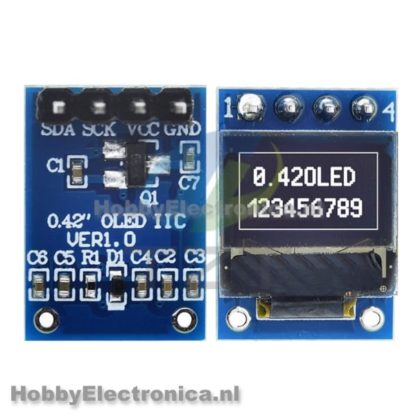 OLED 0.42 module wit IIC Interface. Deze compacte OLED-display module biedt een heldere witte weergave met een hoge resolutie van 72×40 pixels, perfect voor kleine elektronische projecten waar een duidelijke visuele output nodig is. Eenvoudige IIC-aansluiting en de pinnen al gesoldeerd.