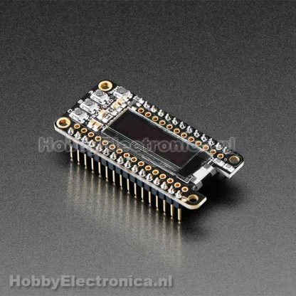 OLED FeatherWing 128×32 voegt een 128×32 monochrome OLED plus 3 gebruikerstoetsen toe aan elk Feather bord. Wordt volledig gemonteerd geleverd, zodat je een FeatherWing bovenop je Feather kunt aansluiten, solderen is niet nodig!