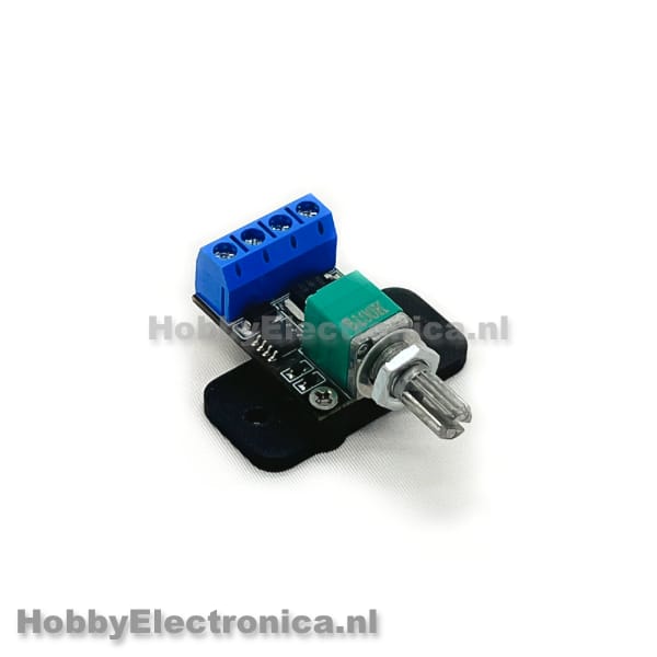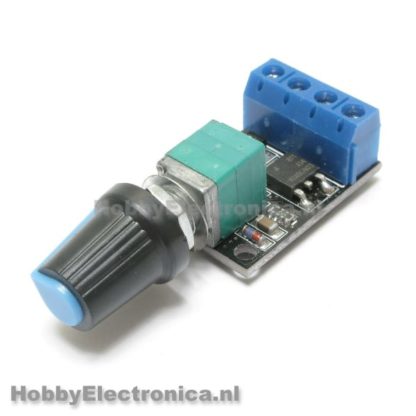 PWM DC controller 10A dimt de output met PWM. Door te draaien aan de knap kan de duty cycle worden ingesteld. Hiermee kan een snelheid van een motor, ventilator of ander dc apparaat worden ingesteld.
