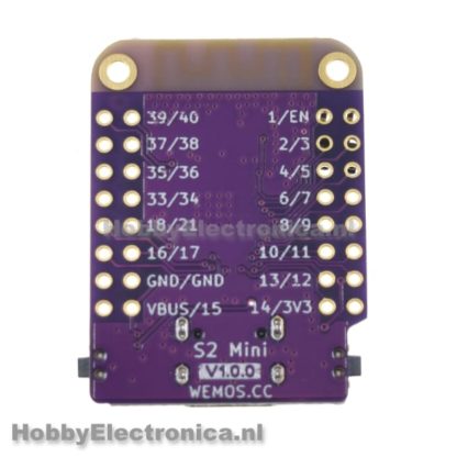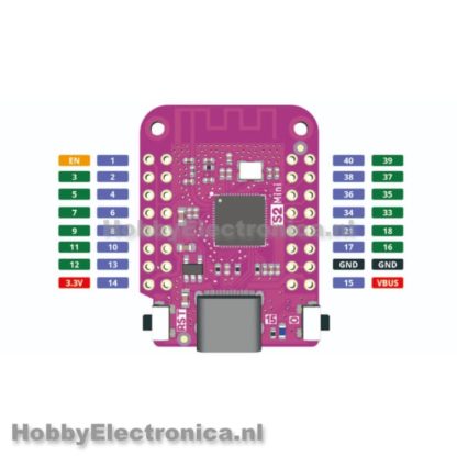 S2 mini ESP32-S2 usb c. Een nieuw bord van Lolin / Wemos met een ESP32 soc en de form factor van de D1, zodat deze compatible is met de shields van de D1. Gebouwd met de ESP32-S2FN4R2 WIFI IC en hierdoor het dubbele aan GPIO pinnen als de D1. USB-C aansluiting voor voeding en programmeren. Het bord heeft 4mb flash en 2mb PSRAM. De Wemos S2 Mini is gemakkelijk te programmeren in Arduino, MicroPython of ESP-IDF. Word geleverd met de firmware MicroPython.