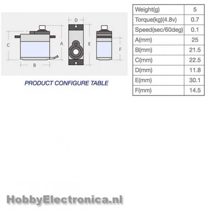 Het is soortgelijk in grootte en gewicht aan Hitec HS-50.
