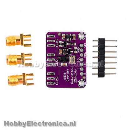 Si5351A Klokgenerator is een I2C controller klokgenerator. Het maakt gebruik van de ingebouwde precisieklok om meerdere PLL’s en klokverdelers te besturen met behulp van I2C-instructies. Door de PLL en de verdelers in te stellen, kunt u precieze en willekeurige frequenties creëren. Er zijn drie onafhankelijke uitgangen en elke kan een andere frequentie hebben. Uitgangen zijn 3Vpp, hetzij via een breadboard-vriendelijke header of, voor RF-werk, een optionele SMA-connector.