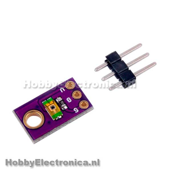 TEMT6000 Licht Sensor Module. De TEMT6000 bestaat uit een enkele fototransistor en werkt als een NPN-transistor. Hoe meer licht er op komt, hoe meer stroom van de collector naar de emitter gaat. De sensor werkt in het zichtbare spectrum (390–700 nm). De infrarood-, ultraviolette straal of ander licht heeft geen effect op de sensor. Werkt op 3.3V en 5 Volt.