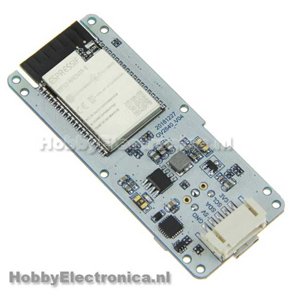 TTGO T-camera ESP32-wrover. Een microcontroller bord op basis van een ESP32. Met ingebouwd een OV2640 camera en een OLED display van 0.96 inch. Micro usb aansluiting voor de stroom voorziening en te programmeren. Heeft een CP2104 USB serieel controller ingebouwd. Dit bord is voorzien van 2,4 GHz dual mode Wi-Fi en een Bluetooth-chip .