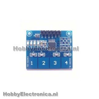 TTP224 capacitive touch digital sensor. De TTP224 is een touchpad detector IC met 4 touch toetsen. De TTP224 detectie IC is ontworpen voor het vervangen van traditionele buttons. Laag stroomverbruik