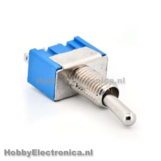 Tuimelschakelaar MTS-102 SPDT Aan-Uit-Aan. De schakelaar heeft 3 pinnen en kan dus 2 draden schakelen. De middelste pin kan, afhankelijk van de stand van de schakelaar, met een van de buitenste pinnen verbonden worden.