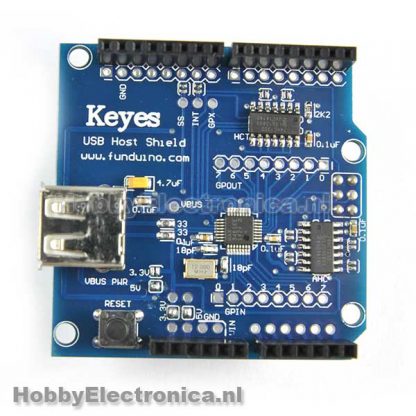 USB Host Shield 2.0 voor Arduino. Ondersteund de google Android ADK en de Android telefoons: G1, Nexus One, Nexus S, Motorola Droid X (vanaf Android 2.3.4, tablets vanaf Android 3.1). Volledige USB host support zodat je met een Arduino USB slave apparaten, digitale camera`s, bluetooth dongles enz. kan communiceren en aansturen.