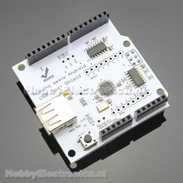 USB Host Shield Arduino is een Development Board ontworpen voor gebruik in embedded toepassingen die USB Host-functionaliteit nodig hebben. Het ondersteunt USB 2.0. Primaire doelplatform is Arduino, maar het kan ook worden gebruikt met andere micro controller, het is voorzien van een SPI interface. Het is nu compatibel met veel meer Arduino boards, zoals de UNO en Duemilanove, maar ook de Mega 2560. Met dit board laat uw Arduino communiceren met andere USB-apparaten en ondersteunt USB-hub-functie.