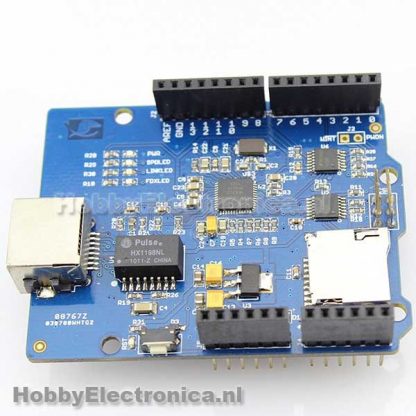W5200 Ethernet Shield verbindt uw Arduino board met het internet in slechts enkele minuten. Gewoon aansluiten op uw Arduino board en sluit deze aan op uw netwerk met een RJ45-kabel (niet inbegrepen) en volg een paar eenvoudige instructies om te beginnen.