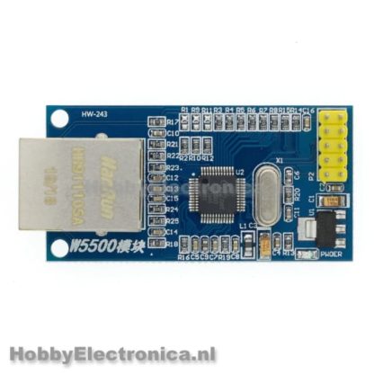 W5500 ethernet network module met een SPI interface. Deze ethernet module is gebaseerd op de W5500 chip, de opvolger van de W5100 en W5200. Deze module is over SPI aan te sturen, en heeft de hele TCP/IP protocol stack al geïntegreerd. Zo wordt het erg gemakkelijk om een Arduino project over ethernet te laten communiceren. Heeft een 3.3v logic circuit. Moet worden gevoed met 3.3V – 5V en minimaal 200mA, continue en stabiele voor een goede verbinding.
