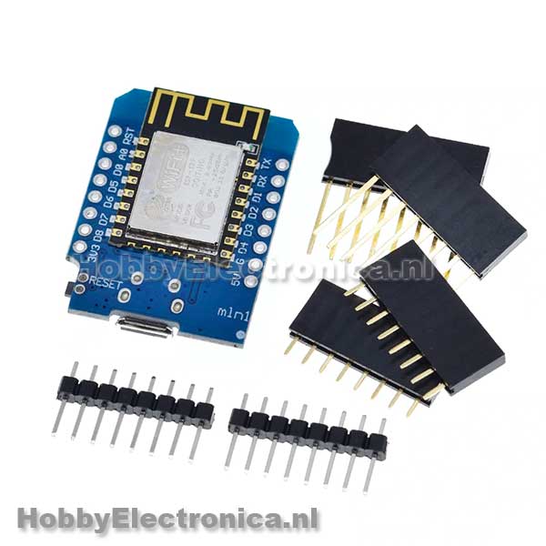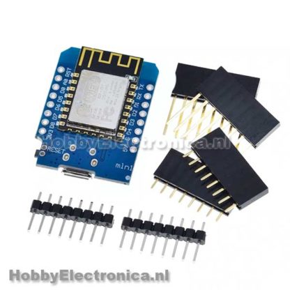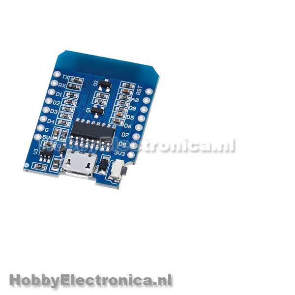 D1 mini V2 CH340G is een mini WiFi microcontroller bord op basis van de 8266 ESP-12F. Het heeft naast WiFi, 11 digitale pinnen. Op de D0 pin na ondersteunen alle pinnen interupt, PWM, I2C en het one wire protocol. 1 analog input met 3.2V max input. Een micro USB verbinding voor voeding en programmeren. Werkt met de Arduino IDE of met NodeMCU. Hij past op een breadboard en word geleverd met headers. Er zijn ook veel verschillende shields beschikbaar om functionaliteit toe te voegen. Deze klik je er eenvoudig op. De pinnen zitten rechtstreeks op de ESP-8266 en hebben een 3.3V logica.
