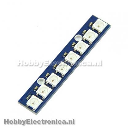 WS2812 5050 RGB LED Module bevat 8 kleine 5050 (5 mm x 5 mm ) slimme RGB LED’s op een PCB met montagegaten in een schakelbare ontwerp. Gebruikt slechts 1 microcontroller pin voor de aansturing. Elke LED is adresseerbaar dmv de chip in de LED.