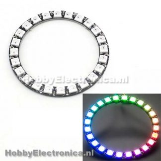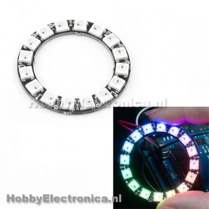 WS2812 5050 RGB LED Ring 16. Led ring met 16 RGB LED’s. De ringen zijn koppelbaar. Sluit de output pin van de ene naar de input pin van een ander. Elke LED is apart aan te sturen dmv de driver chip per LED. Aan te sturen met 1 pin.