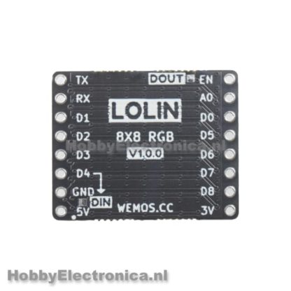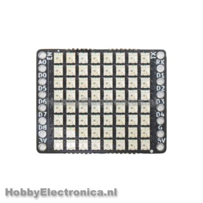 Ws2812B 8×8 RGB shield D1 mini. Een matrix van 8 bij 8 met 64 ws2812 leds, die via 1 pin, D4 te besturen is.