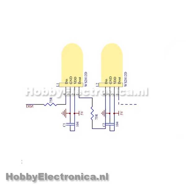 WS2812D-F5-L rgb 5mm led met ws2811 chip ingebouwd. Aan te sturen met een neopixel library of elke andere library of driver voor ws2812 chips. Meerder led’s zijn te koppelen door de Dout pin te koppelen aan de Din pin van de volgende led(zie product foto 2).