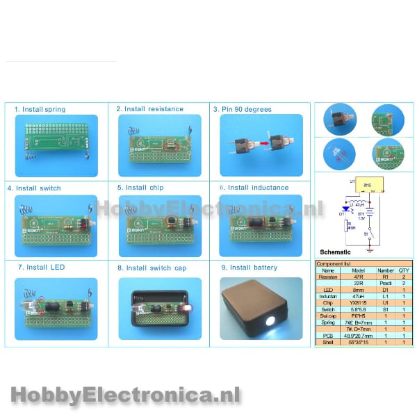Eenvoudig kit on te leren solderen. De print op de pcb laat zien waar de componenten moeten komen. Langste poten aan de componenten is de + en de korte poot de -.