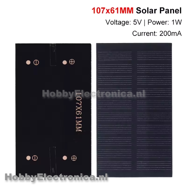 Zonnepaneel 1W 5V 200mA, afmetingen 107 x 61mm.